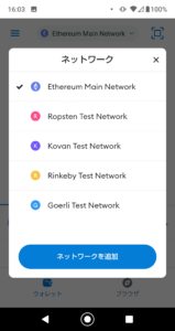 画面の一番上の中央部分の「Ethereum Main Network」をタップします。(AndroidスマートフォンでMetaMaskウォレットをインストールするとデフォルトでは「Ethereum Main Network」と表示されていました。)
